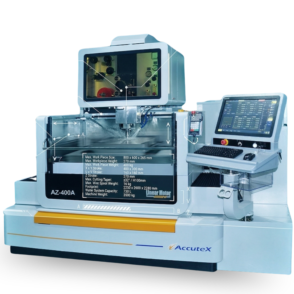 Equipped with an X/Y stroke of 400 x 300 mm and a U/V stroke of 160 x 160 mm, the AZ-400A offers exceptional multi-axis CNC control for complex geometries. A Z stroke of 270 mm and a maximum cutting height of 270 mm ensure versatility across a wide range of workpiece dimensions, while the ±32° taper cutting capability (at H100mm) enables precise angled cuts for intricate part profiles.