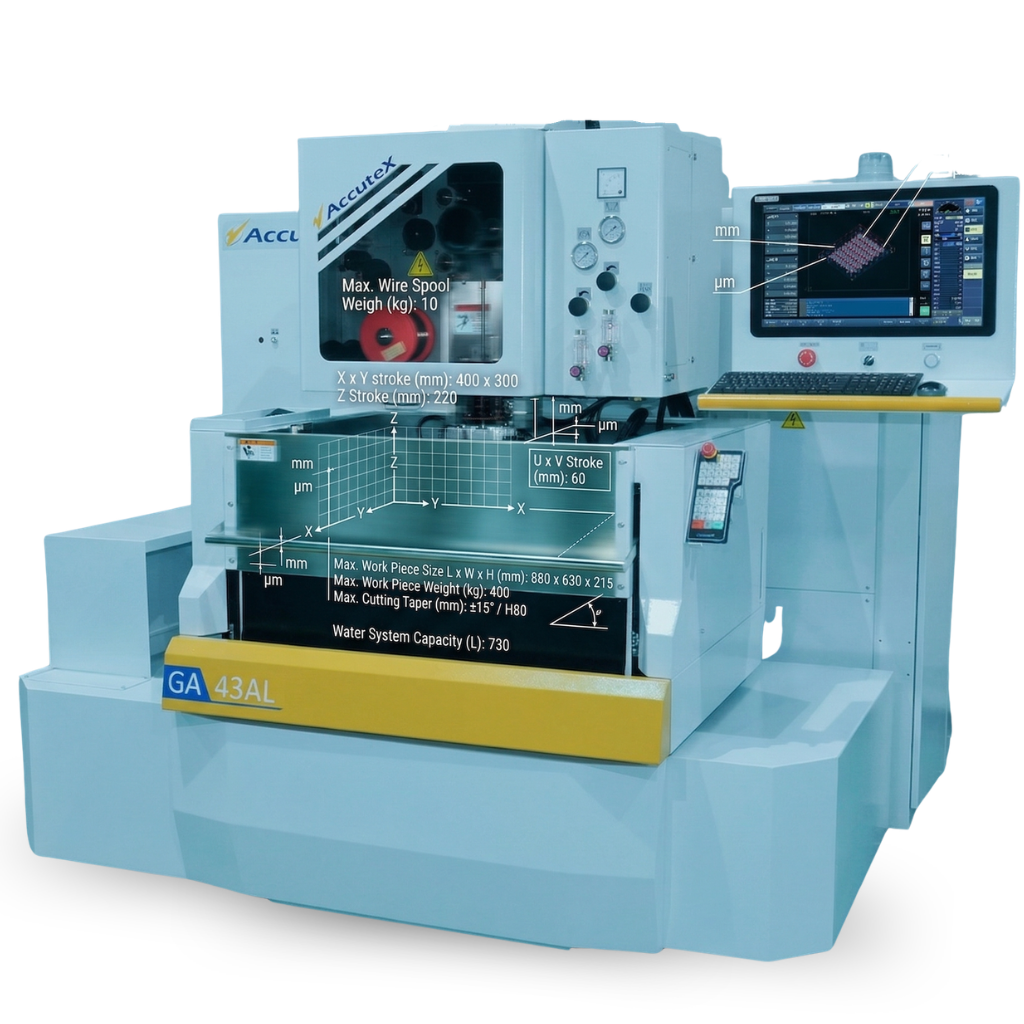 The GA-43AL is a high-performance Wire Cut EDM (Electrical Discharge Machining) machine engineered for precision CNC machining applications. Designed to accommodate workpieces up to 880 x 630 x 215 mm and a maximum weight of 400 kg, this machine delivers reliable, heavy-duty cutting performance for demanding industrial environments.
