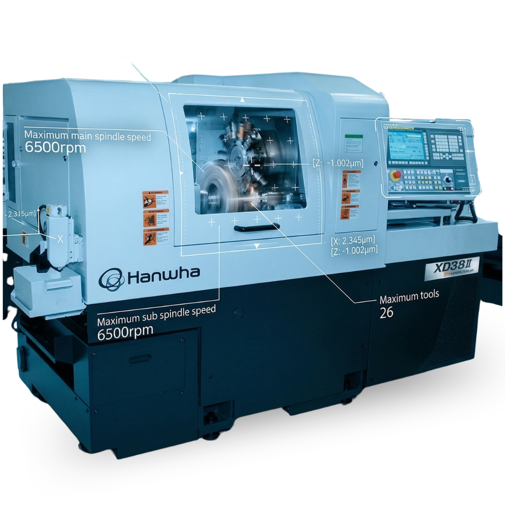 The Hanwha Dugard XP26 is a high-performance sliding head CNC lathe designed to bridge the gap between traditional fixed head technology and the precision of Swiss-type turning.