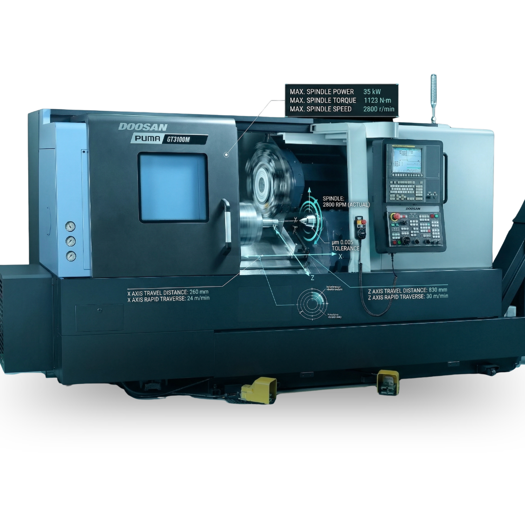 The “M” in the model name highlights its milling capability, featuring a high-torque BMT turret for integrated turn-mill multitasking. This allows operators to perform turning, milling, drilling, and tapping in a single setup, significantly reducing cycle times and eliminating the errors caused by moving parts between machines. By streamlining the manufacturing process, the Puma GT 3100M maximizes shop floor productivity and lowers the cost per part.