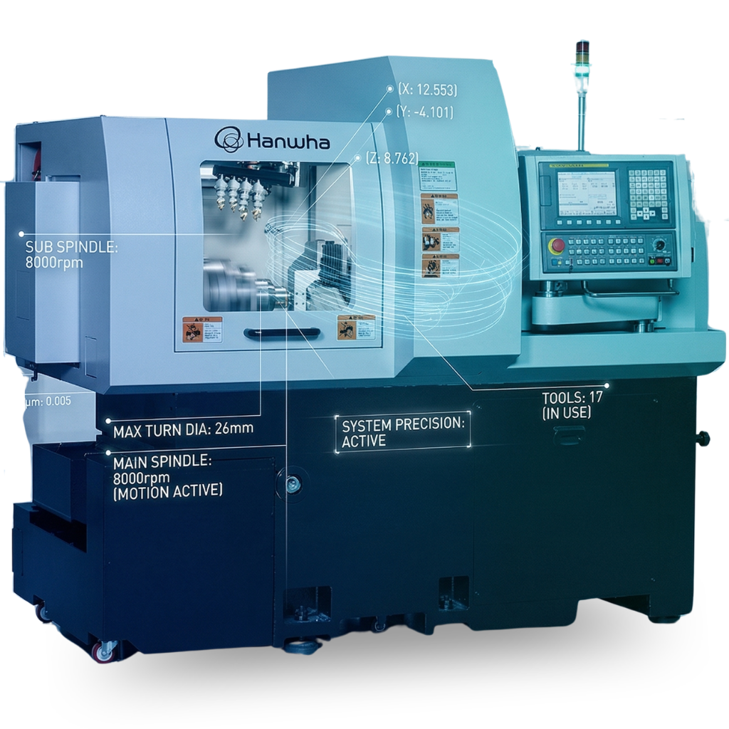 Featuring a 26mm maximum turning diameter and synchronized 8,000 rpm main and sub-spindles, this machine is optimized for high-speed, complex part production with minimal cycle times.